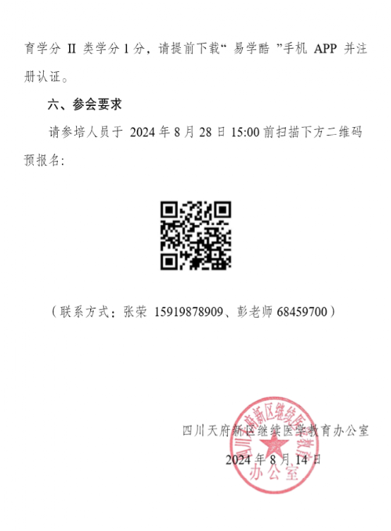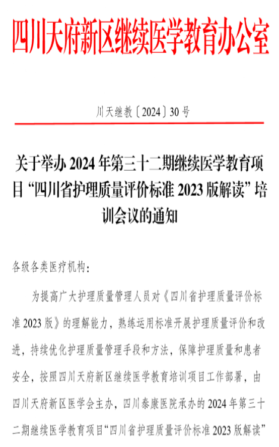 为提高广大护理质量管理人员对《四川省护理质量评价标准2023版》的理解能力,熟练运用标准开展护理质量评价和改进,持续优化护理质量管理手段和方法,保障护理质量和患者安全。四川泰康医院定于 2024 年8月29日举办2024年天府新区医学会第三十二期继续医学教育项目“四川省护理质量评价标准2023版解读”培训,敬请广大医护人员参会!