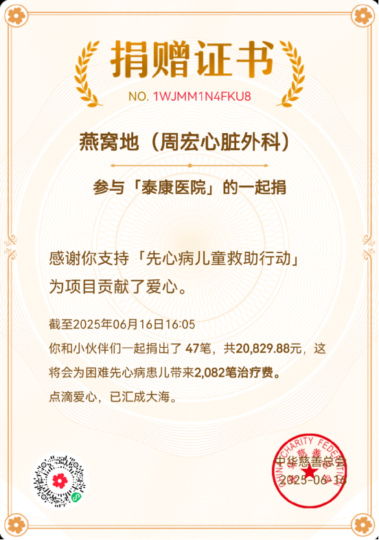 中华慈善总会新闻界志愿者促进委员会先心病救助项目为泰康医疗开通的腾讯公益“一起捐”二维码,将于2025年九九公益日正式上线