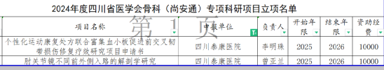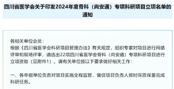 近日,四川省医学会2024年度骨科(尚安通)专项科研项目发布通知,我院骨科李明珠、曾亚兰分别申报的项目获批立项。
