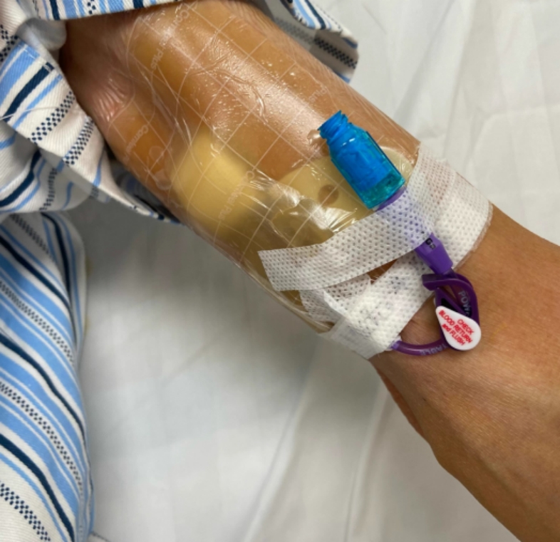最近胡叔叔女儿获知四川泰康医院开诊的消息后,联系到肿瘤科主任曾铭,曾主任评估病情后收治胡叔叔入院。患者及家属的信任让肿瘤科医生团体倍感开心,也深感责任重大。入院时胡叔叔血红蛋白降至92g/L,体重减到82斤,存在重度营养不良风险,需要接受肠外营养。但外周静脉输注脂肪乳等静脉营养液时,胡叔叔出现明显静脉炎,急需进行PICC即经外周静脉穿刺中心静脉置管以确保肠外复合营养液的高效输注。然而,患者既往PICC置管并不容易,再次PICC置管更需要高超的技术和丰富的经验。