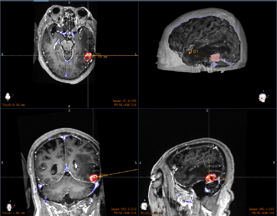 为尽量降低手术风险,减少术后并发症发生,孟辉主任医师团队术前采用神经外科手术机器人RM-100对患者影像资料多模态融合与分析,三维立体精确的显示肿瘤与周围正常脑组织、血管毗邻关系:肿瘤定位于左侧颞下回后部与梭状回之间,基底起源于小脑幕,边缘紧贴横窦末端,与下吻合静脉关系紧密。