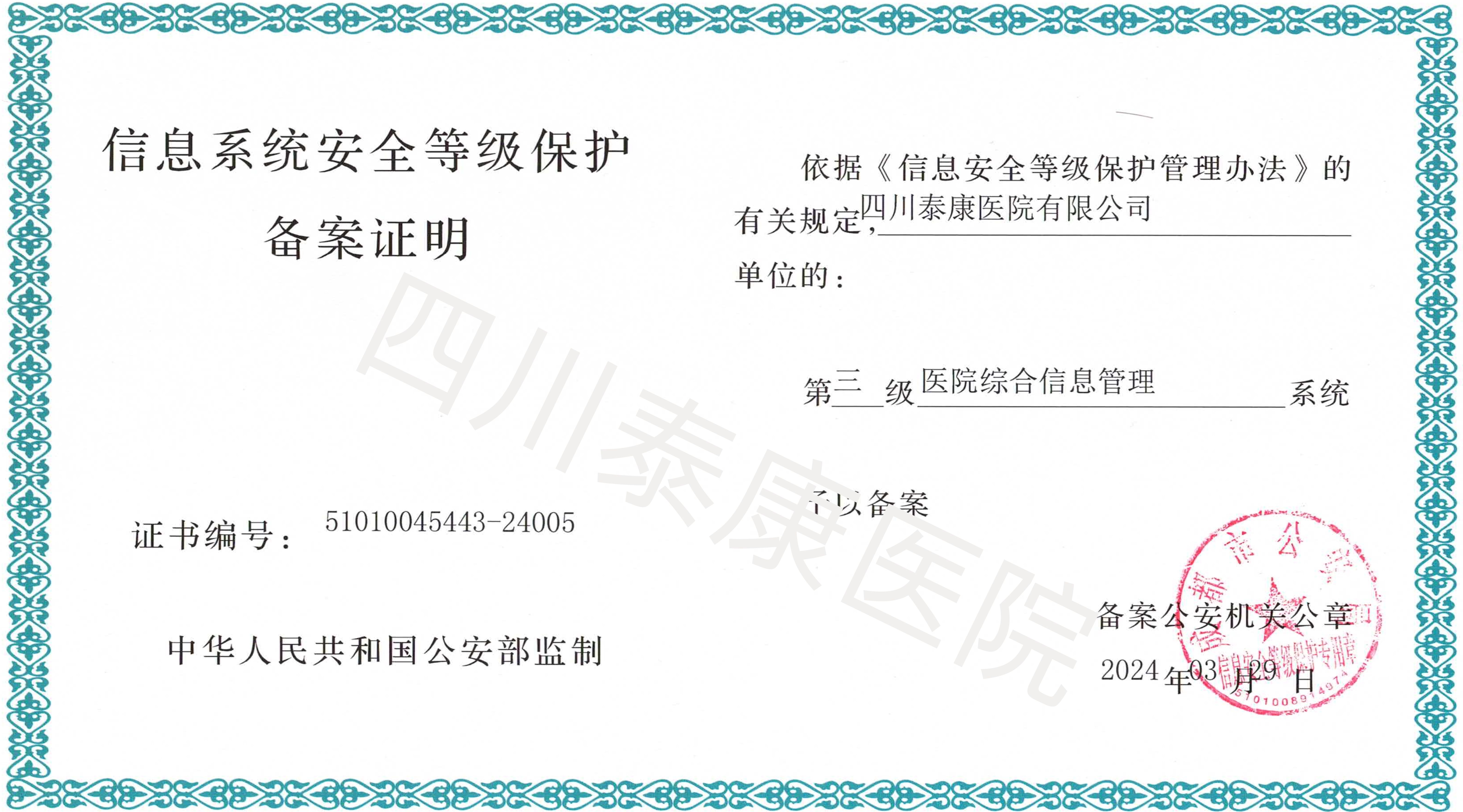 5月23日,四川泰康医院收到成都市公安局颁发的三级等保备案证书。