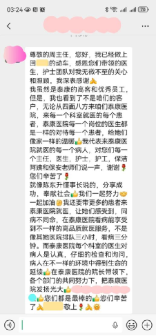 我虽然是泰康的高客和优秀员工,但是,我也看到了不是咱们的客户,无论从四面八方来咱们(四川)泰康医院,来每一个科室就医的每个患者,(四川)泰康医院每一个岗位的医生都是一样的对待每一个患者,给她们像家一样的温暖。我代表来泰康医院就医的每一个病人,对您们每一个主任,医生,护士,护工,保洁阿姨和保安老师们说一声,谢谢 您们辛苦了。
