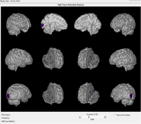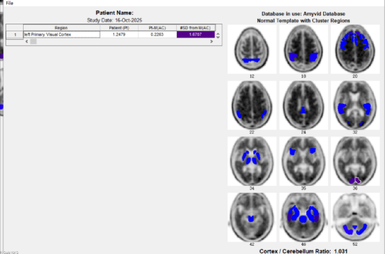 诊断意见:大脑双侧枕叶皮质初级视觉皮层aβ淀粉样蛋白(轻度)沉积阳性,以左侧为主。