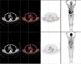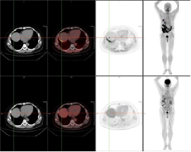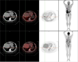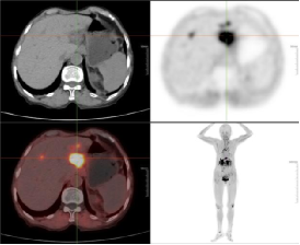 肝顶部及残肝右叶病灶FDG显像未见明显显示,而FAPI显像明显显示,CT密度均未见明显异常。