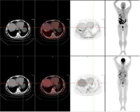 例一:患者53岁男性,肝内胆管癌术后7月余,八周期化疗后复查。图像第一排为FAPI显像;第二排为FDG显像。