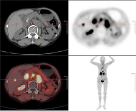 且较本院增强MR及FDG显像新发现肝左叶病灶;右肺门淋巴结FDG显像及FAPI显像均代谢增高,高度怀疑转移灶。