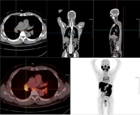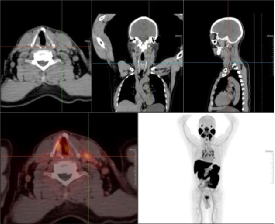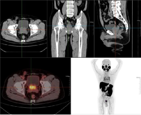 老年男性,前列腺增生病史,发现左侧颈部肿块多年,排尿困难,分叉5年,血精,怀疑前列腺肿瘤。PET/CT图如下。第一排为CT图,第二排分别为融合图、MIP图。
