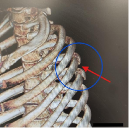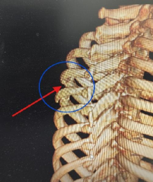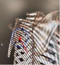 患者需手术的肋骨骨折断点位于肩胛骨深面,且患者肩胛骨已有骨折(见图三、图四)。如果进行传统的肋骨骨折内固定手术,需要切开肩胛骨周围大量肌肉层次,手术带来的创伤较大;